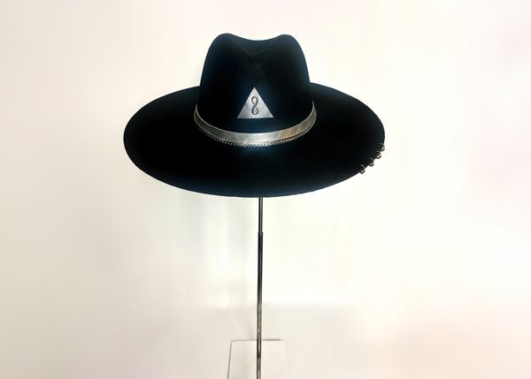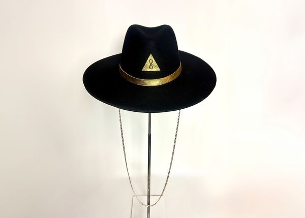 Chapeau fedora / chapeau fait main avec cuir doré et applications bijoux. Grand bord percé. taille réglable ! Pièce unique avec symbole de l'infini et triangle. Chaîne amovible. Doux et soyeux imprimé en ligne en ligne. Impression vinyle.